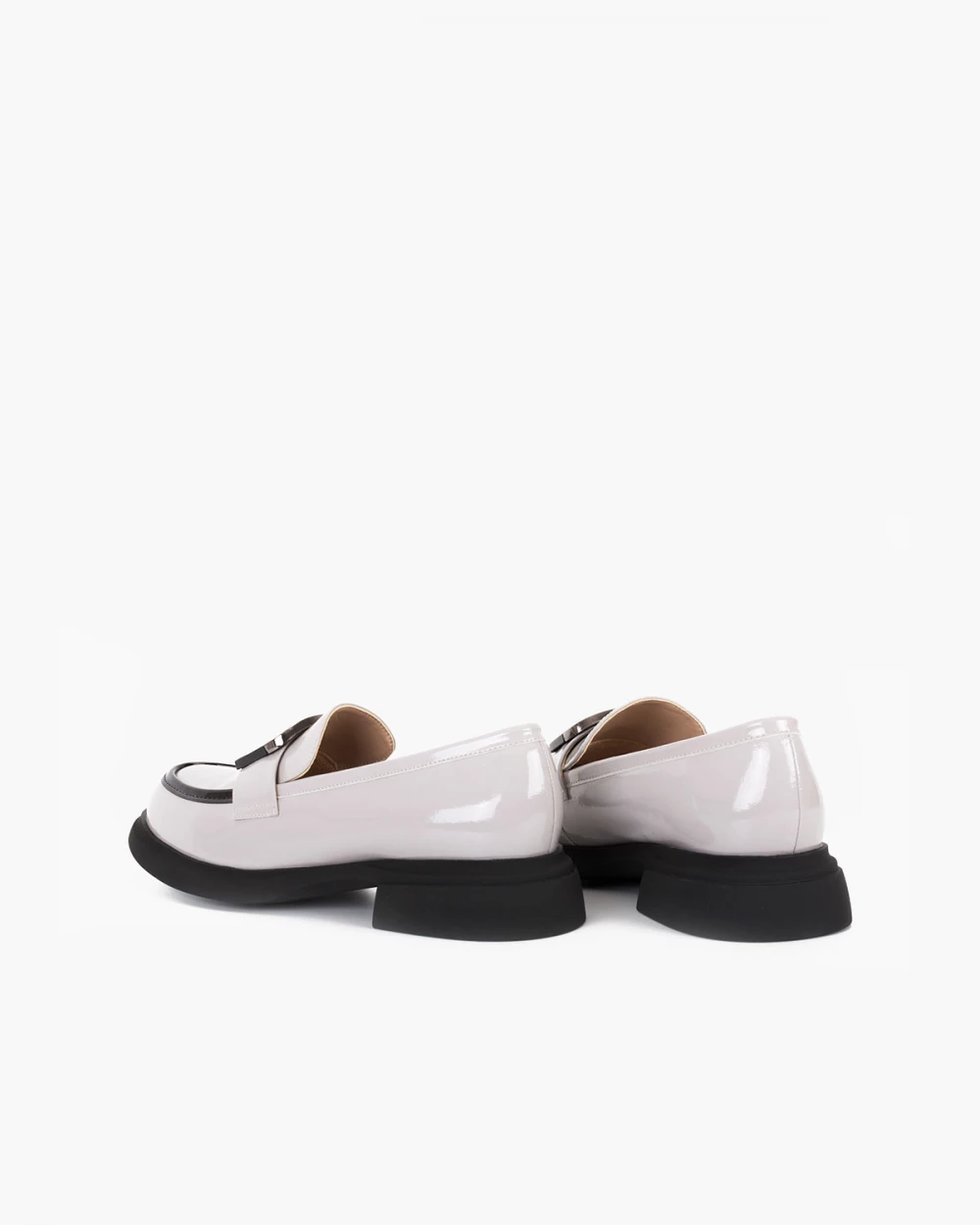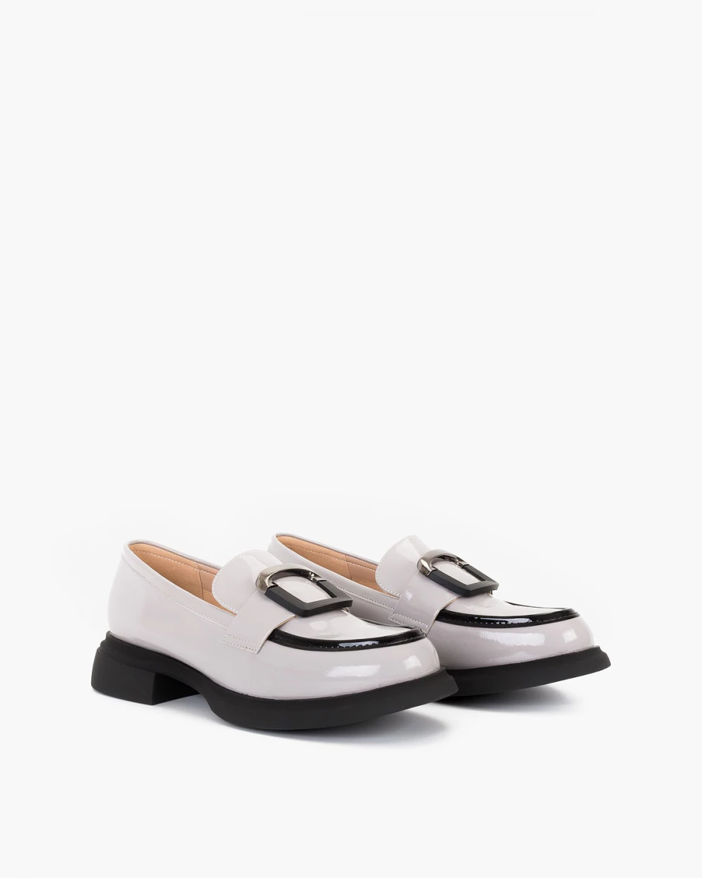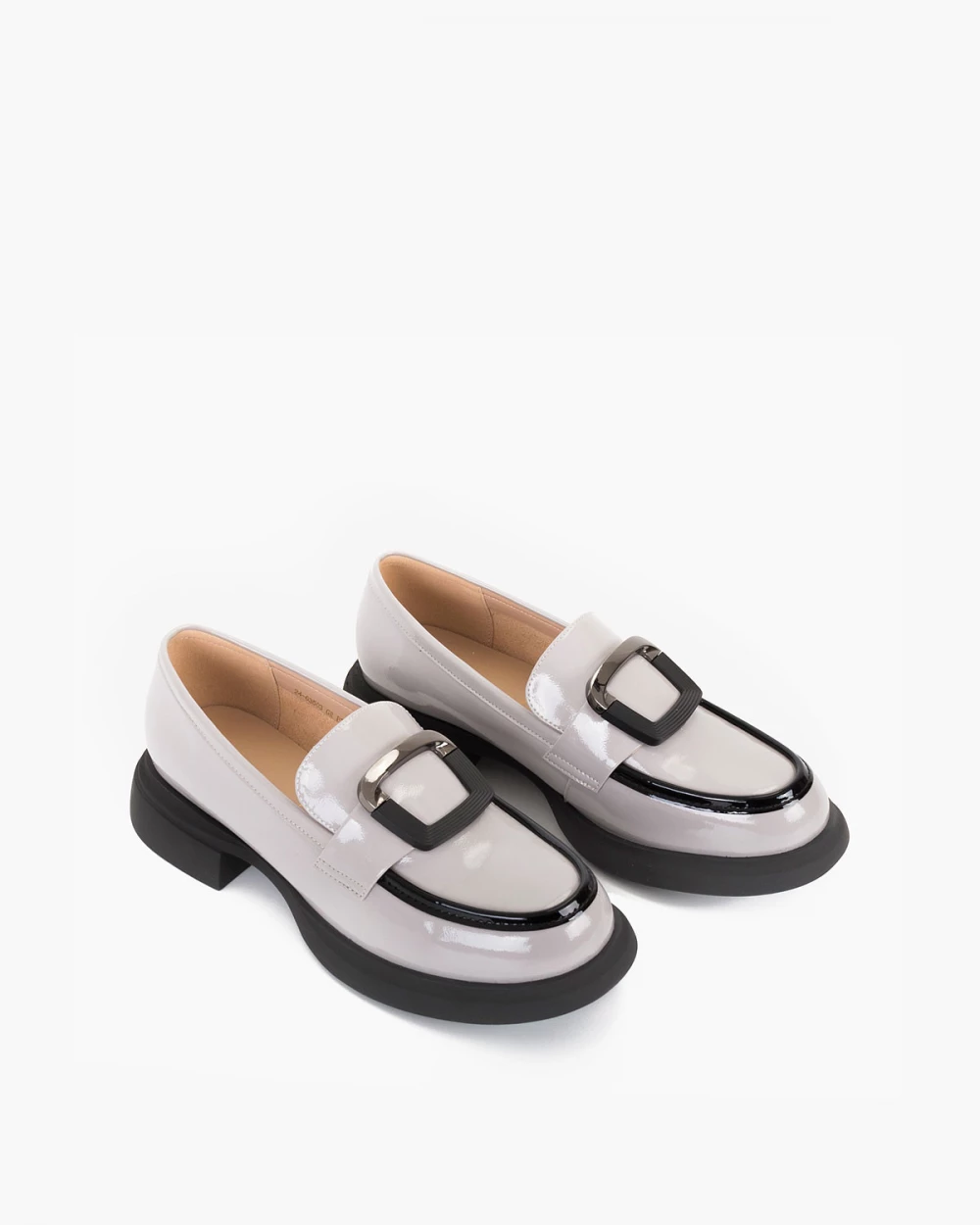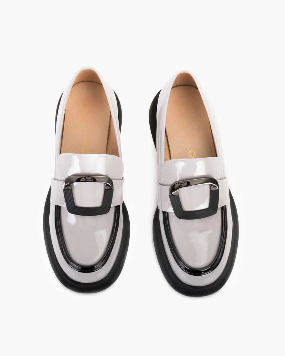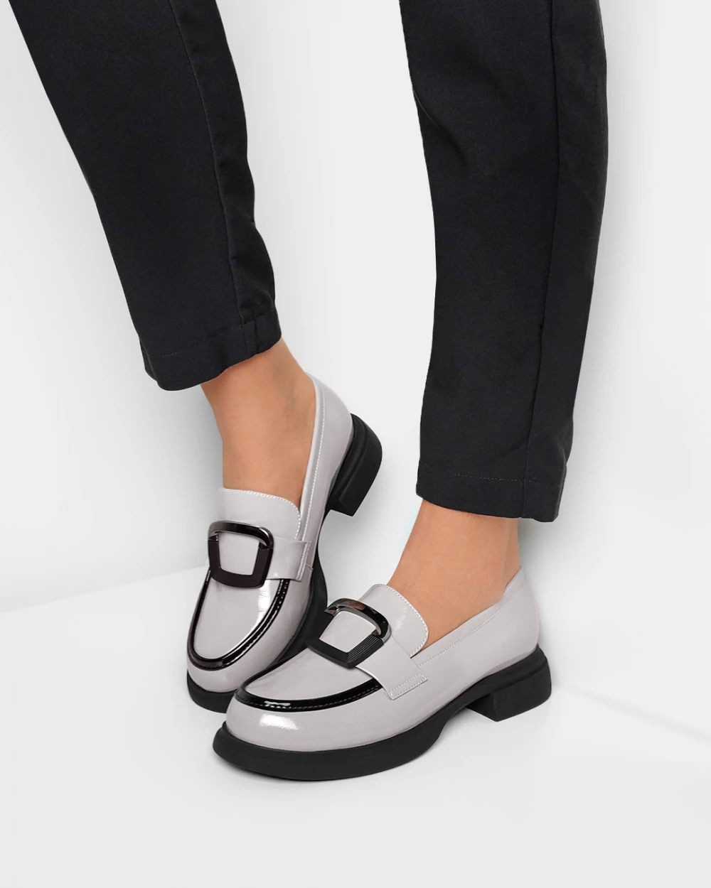 Szare mokasyny damskie lakierowane ze skóry naturalnej na klocku