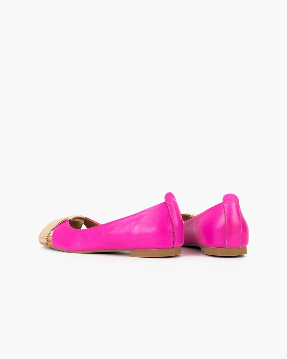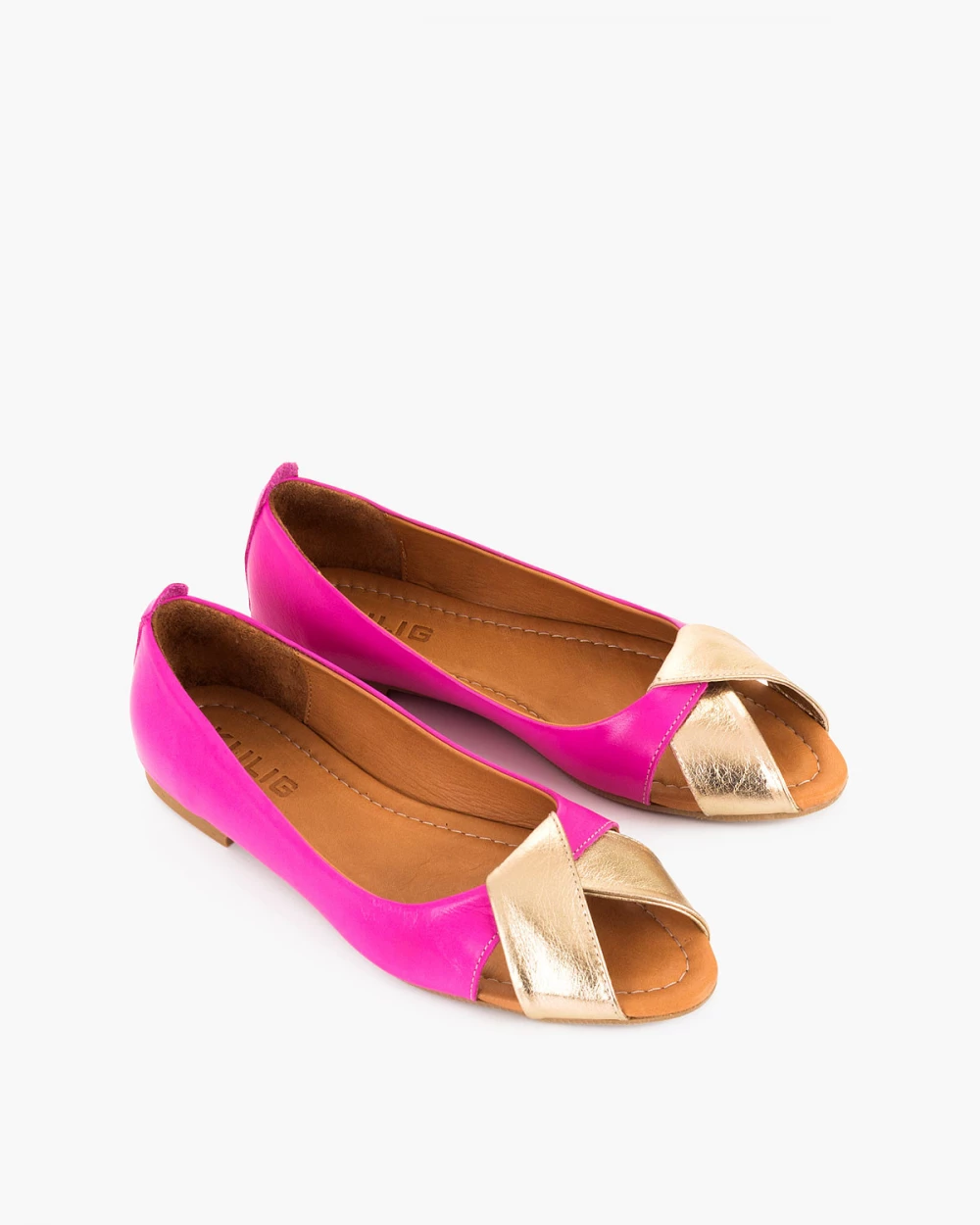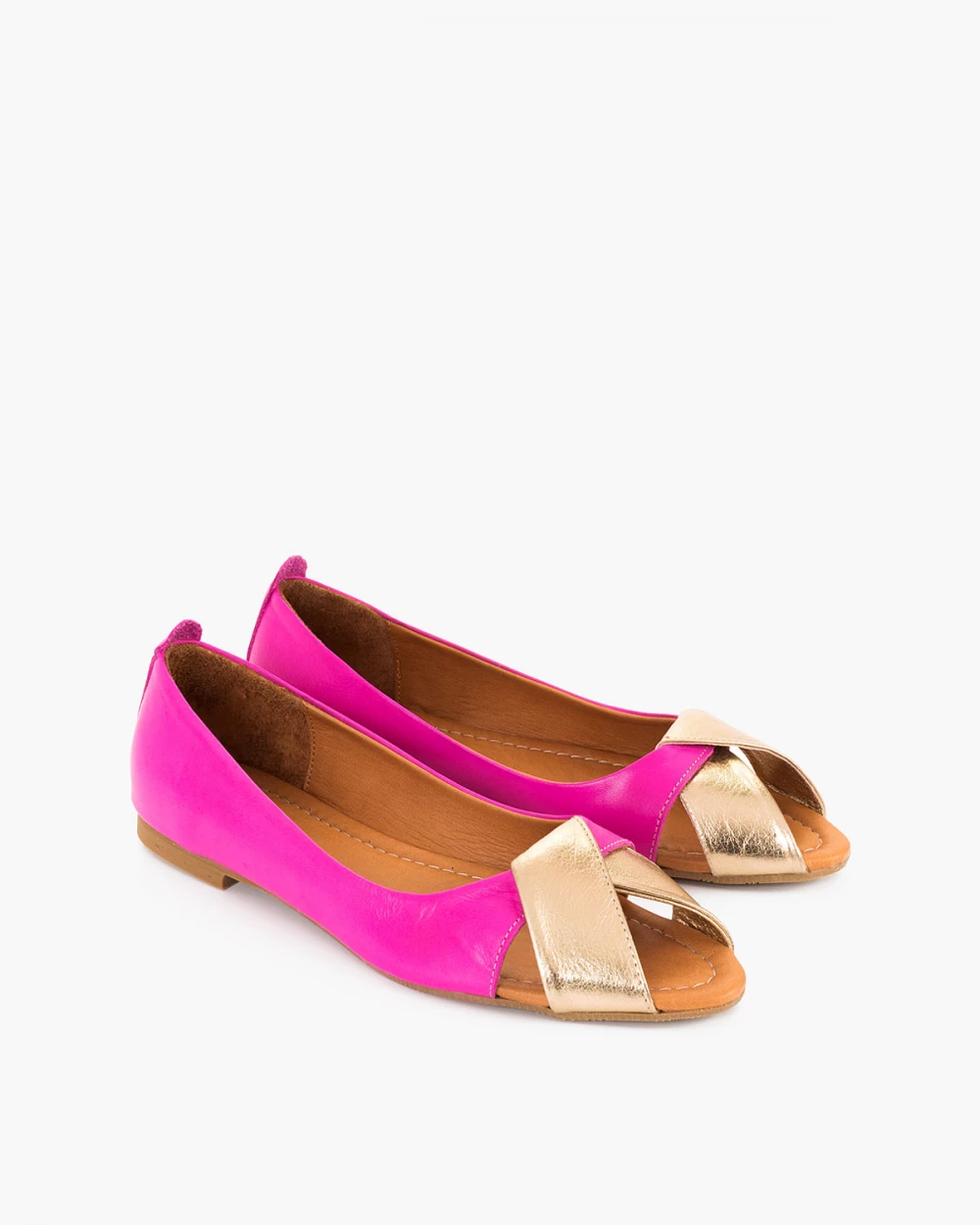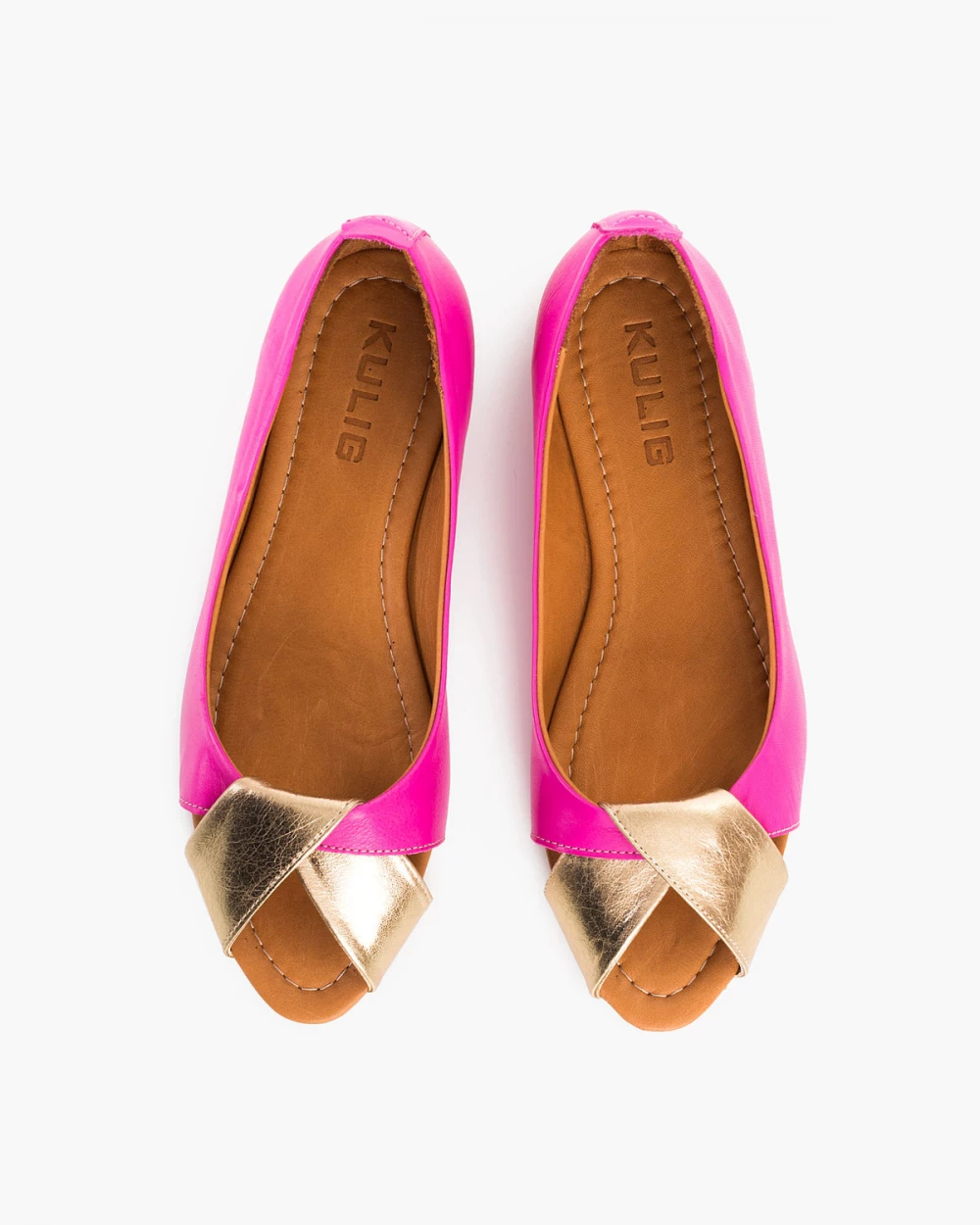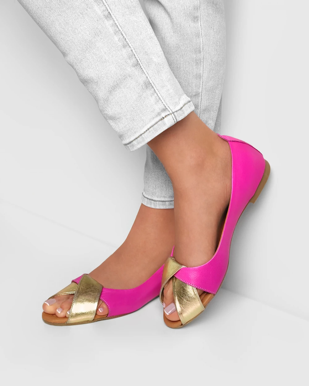 Fuksjowo-złote sandały damskie na niskim obcasie